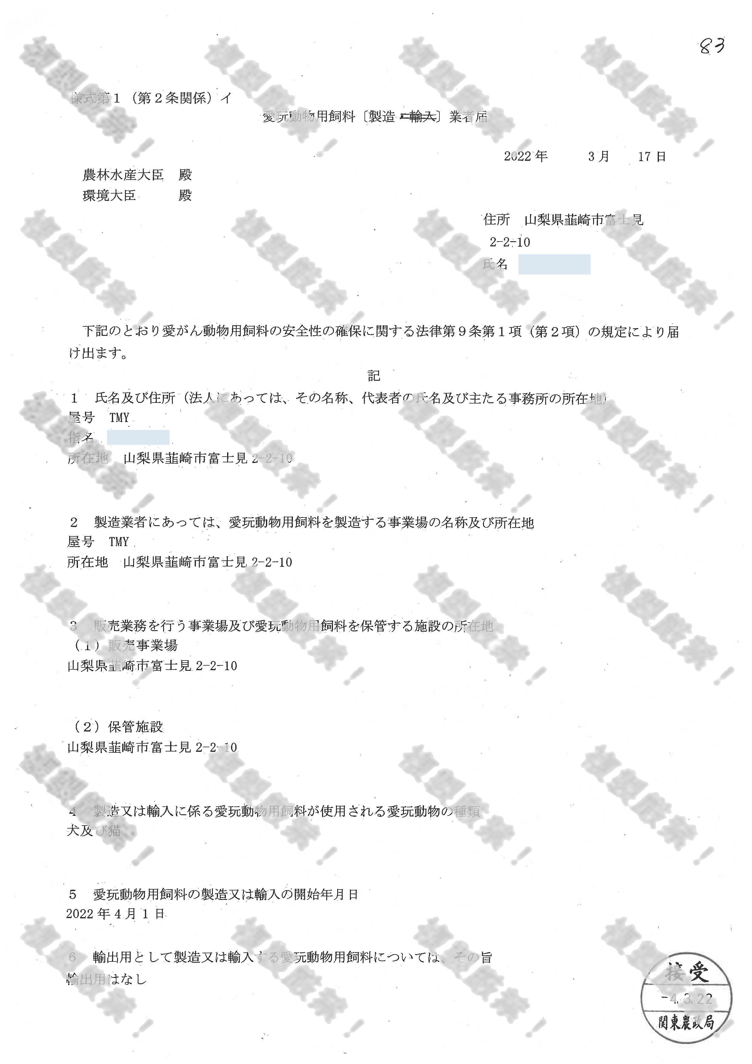 ◆愛玩動物用飼料業者用届提出済